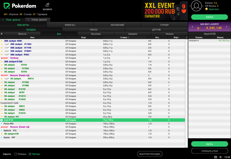 Пул игроков для всех игровых приложений ПокерДом является единым. Таким образом, вы будете вести игру против тех же самых оппонентов, что пользуются десктопными клиентами и мобильным софтом.