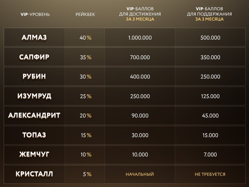 Как видно, начальным уровнем является «Кристалл». Он присваивается покеристу сразу же, после регистрации. Игрок с таким статусом получает гарантированно рейк-бек в размере 5%. Чтобы увеличить эту цифру, покеристу нужно набрать в течение 3 месяцев определенное количество баллов – для каждого VIP-статуса оно свое.